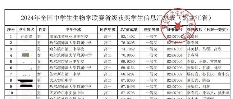 近日,2024年全国中学生生物学联赛省级获奖结果揭晓。黑龙江省林业卫生学校学生由益嘉以83.14的优异结果斩获黑龙江全省一等奖第一名。