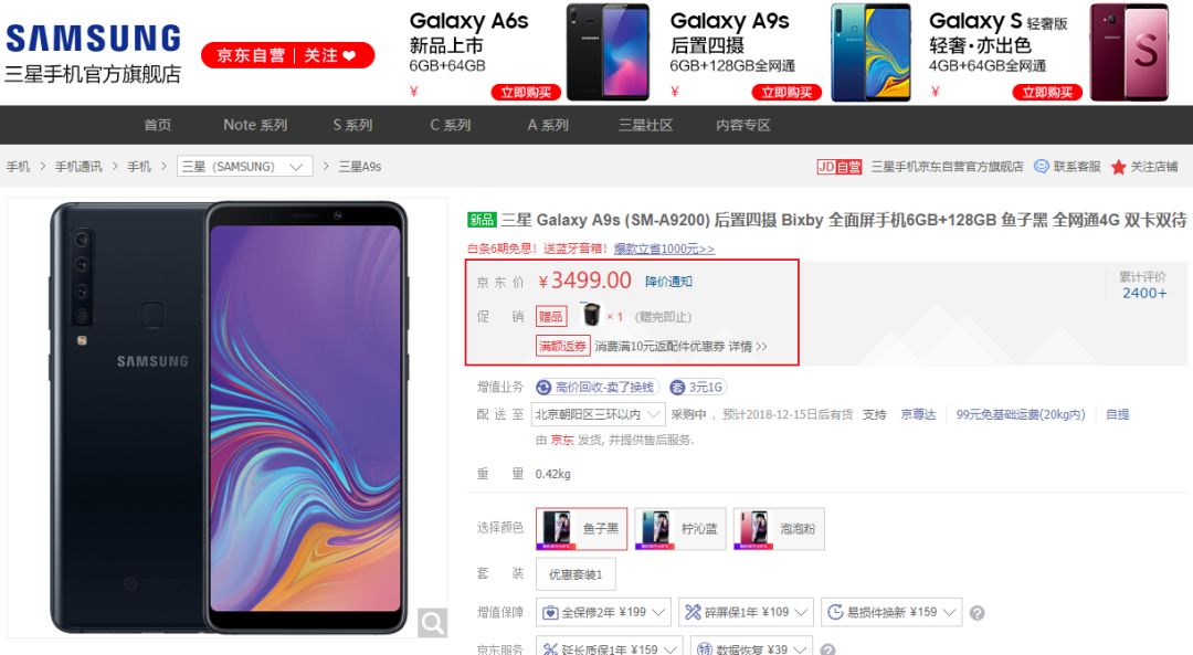 每日经济新闻(微信号:nbdnews)记者注意到,这款Galaxy A8s手机在京东三星官方旗舰店上的预售价格为3499元,也是目前国产智能手机竞争最激烈的价位。